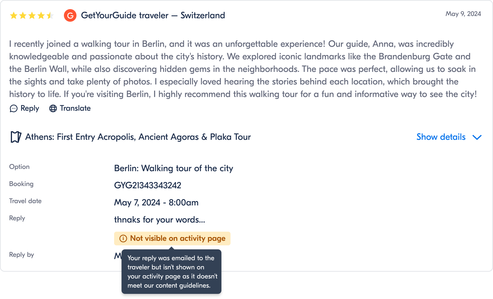Antworten, in denen GetYourGuide erwähnt wird, werden zum Schutz unserer Marke herausgefiltert. Erwägen Sie eine Neuformulierung ohne die Erwähnung von GetYourGuide, da andernfalls die Bewertung nicht auf Ihrer Produktseite angezeigt wird und diese Maßnahme nicht rückgängig gemacht werden kann. Bitte beachten Sie: Auch wenn Ihre Antwort nicht sichtbar ist, hat Ihre Kundin bzw. Ihr Kunde die Antwort dennoch erhalten. -