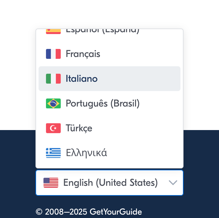 Η πύλη παρόχων προσφέρει επιλογές γλώσσας για αποτελεσματική χρήση της πλατφόρμας και δημιουργία προϊόντων για παρόχους που δεν είναι από την Αγγλία, βελτιώνοντας τις προσφορές της GetYourGuide.