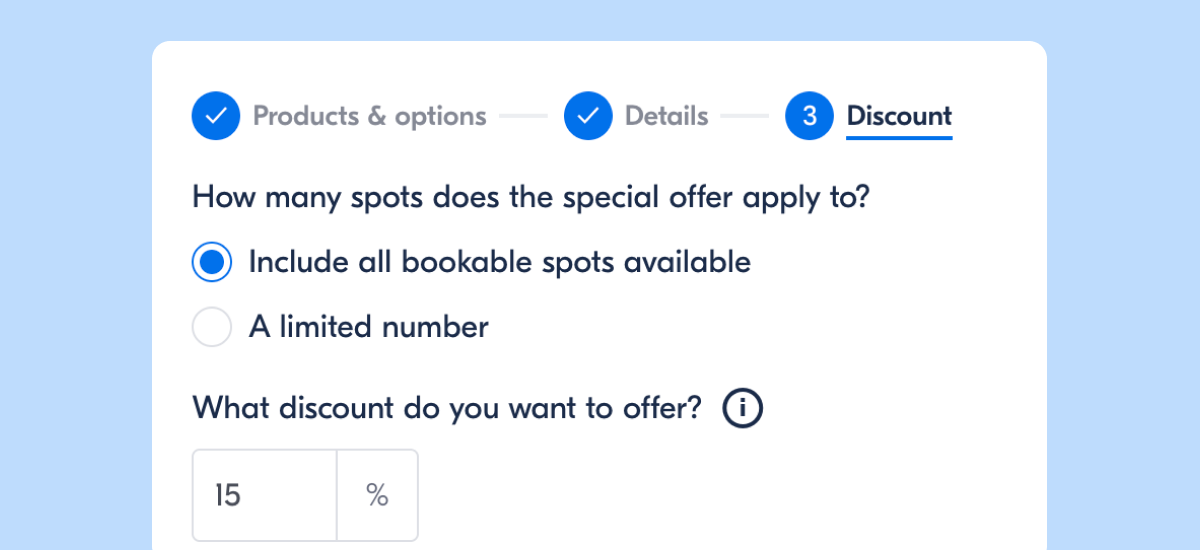 For last-minute offers: "2 days booking notice" means travelers must book within 2 days of the activity date. For example, if the activity date is June 15 and you set a 2-day booking notice → Travelers can get the discount if they book on June 13, 14, or 15 (depending on your product’s cut-off time).