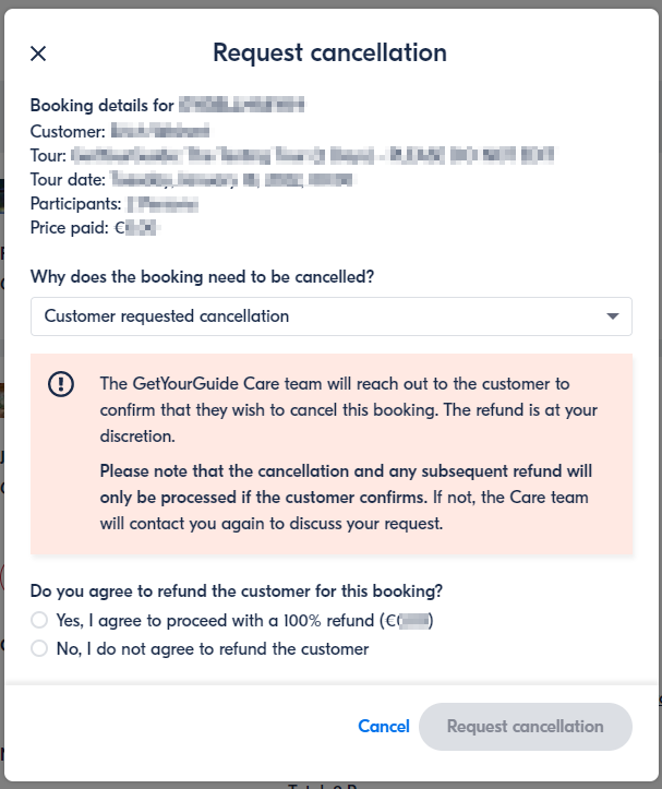 - Provide an explanation for the cancellation (this will be shared with the GetYourGuide team).