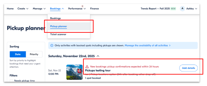 Overview of Bookings: Access this via Bookings > Pickup Planner to view tours with pickups and search by date.