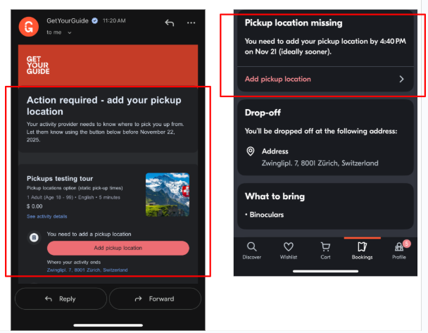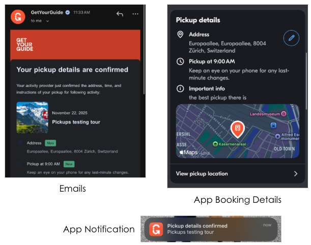 As you can see in the screenshots below, the customer won’t have information about the time or location, and they’ll receive the following emails and details in their booking summary. As a result, they may be confused about their pickup details and contact you and/or customer support with questions or concerns. Customers rely on the GetYourGuide booking details page in the app or web summary page, so it’s important this has the latest pickup information to be the source of truth for them.