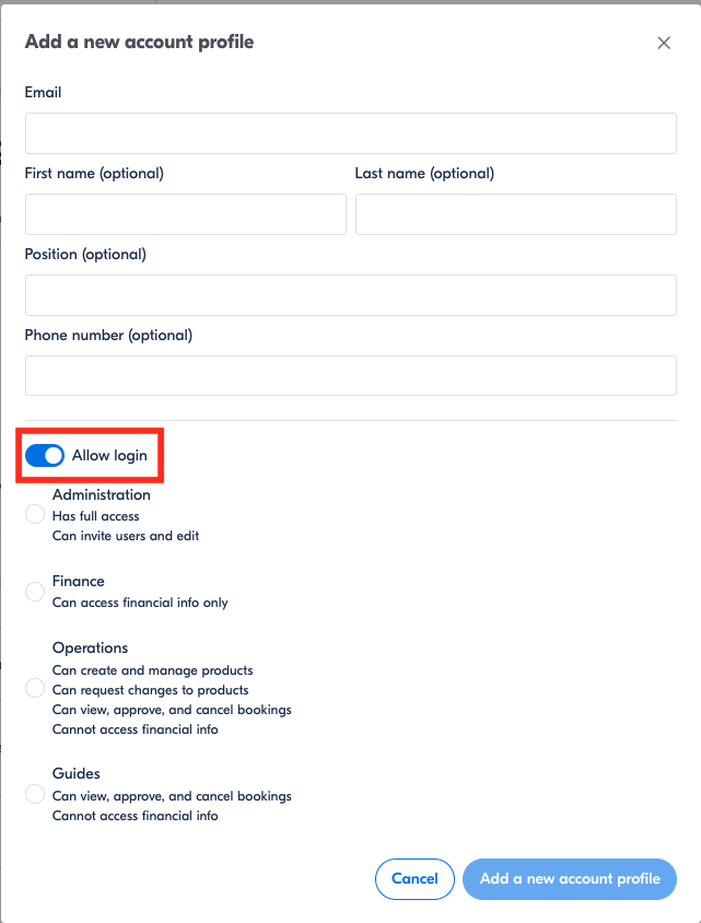 - Paso 5: haz clic en Añadir un nuevo perfil de cuenta si añades un nuevo usuario, o haz clic en Guardar cambios si estás modificando un usuario existente. Si se añade un nuevo usuario, se enviará un enlace de confirmación a la dirección de correo electrónico del contacto, que deberá confirmar para activar su cuenta.