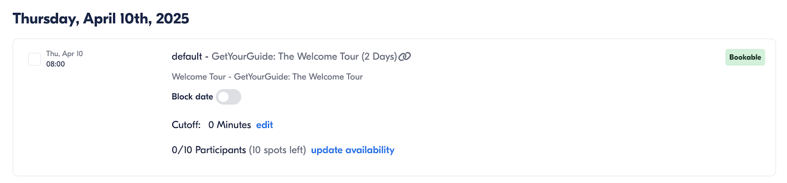 Si sabes que el tour empezará a una hora determinada, puedes reducir la hora límite para esa franja horaria concreta, para asegurarte de que las plazas restantes están reservadas. Actualizar tu hora límite a nivel de franja horaria te permite ofrecer una mayor disponibilidad de última hora.
