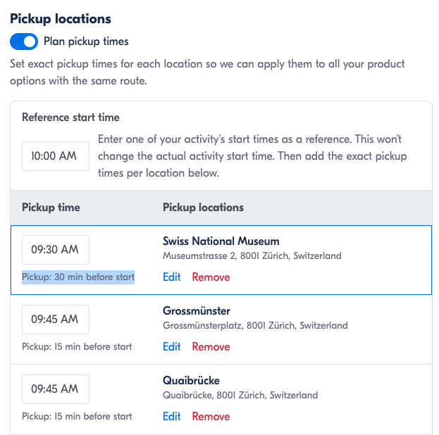 R: No, esta función actualmente solo está disponible para recogidas basadas en la ubicación. Si el tour incluye múltiples lugares de recogida específicos con horarios de recogida constantes, esta función es ideal para tus necesidades.