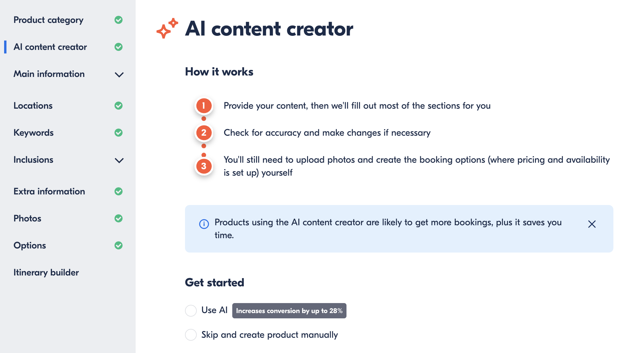 Après avoir choisi l'anglais comme langue pour créer le produit, vous accéderez à la page IA de création de contenu .