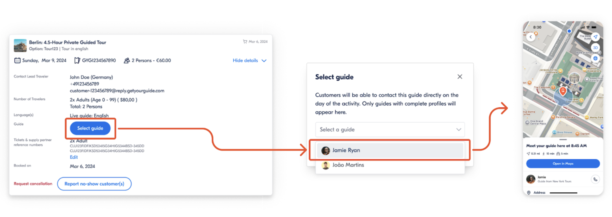 - Les client·es pourront voir le nom, la photo et le numéro de téléphone de la/du guide en consultant les informations sur le lieu de rendez-vous.