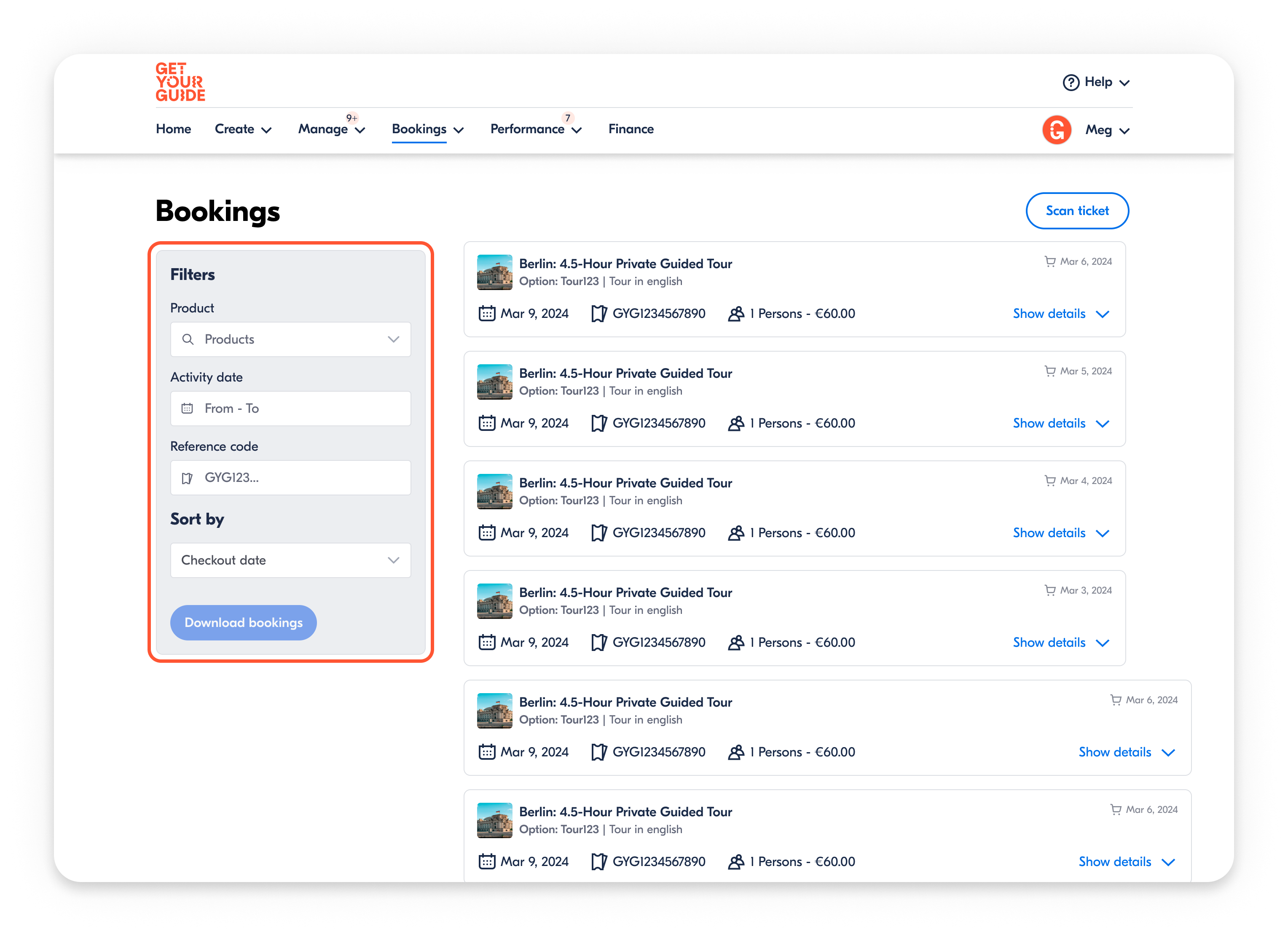 - Trova le opzioni di filtro: a lato dell'elenco delle prenotazioni, vedrai opzioni come Prodotto, Data dell'attività, o Codice di riferimento. Questi sono i tuoi filtri.