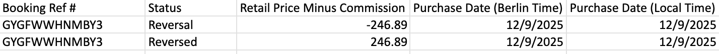 ⚠️「通常」は、サプライパートナーによるキャンセルに対する補償を示す場合もあります。 これは、サプライパートナーがサービスを提供できず、自ら予約をキャンセルした場合に発生します。 このような場合、影響を受ける予約参照には「通常」のステータスが表示され、小売価格はゼロ、コミッション調整額は小売価格の25%に相当するマイナスの金額が表示されます。 詳細については、利用規約のセクション 3.10 を参照してください。