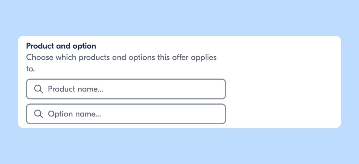 Selecione o produto e a opção aos quais você deseja que a oferta seja aplicada. Você pode selecionar mais de um.