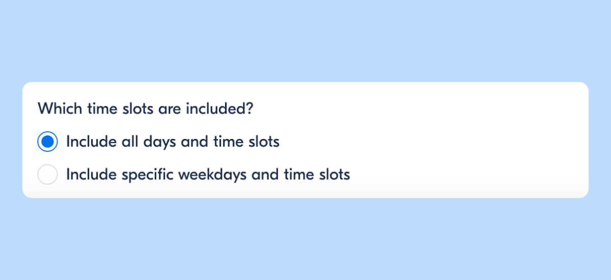 Escolha dias específicos da semana, se quiser (como apenas segundas e terças-feiras), ou escolha horários específicos, se quiser (como apenas excursões às 14h). Por padrão, ela se aplica a todos os horários.
