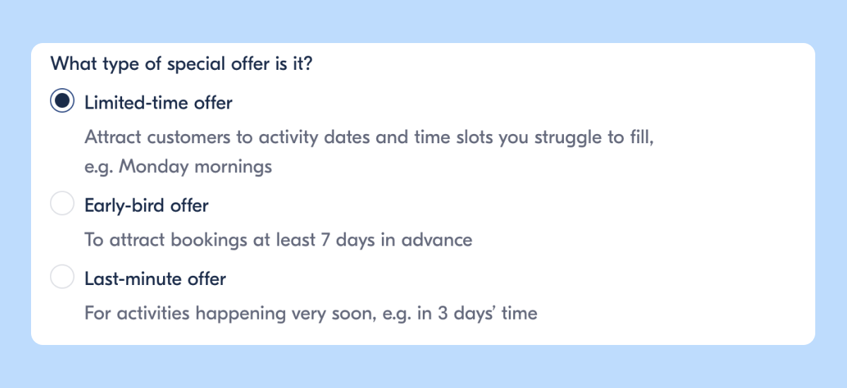 Para ofertas de última hora: "aviso de reserva de 2 dias" significa que os viajantes devem reservar dentro de 2 dias da data da atividade. Por exemplo, se a data da atividade for 15 de junho e você definir um aviso de reserva de 2 dias, → os viajantes podem receber o desconto se reservarem em 13, 14 ou 15 de junho (dependendo do horário limite do seu produto).