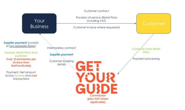 - GetYourGuide ให้ใบแจ้งหนี้รายเดือนแก่คุณ (สรุปราคาขายปลีกจากการจองของลูกค้าลบค่าคอมมิชชั่นของ GetYourGuide) มีการเชื่อมโยงโดยตรงระหว่างเงินที่ลูกค้าชำระ (ราคาขายปลีก) และบริการที่คุณให้ - สัญญาลูกค้าและการให้บริการนั้นอยู่ระหว่างคุณและลูกค้าโดยตรง
