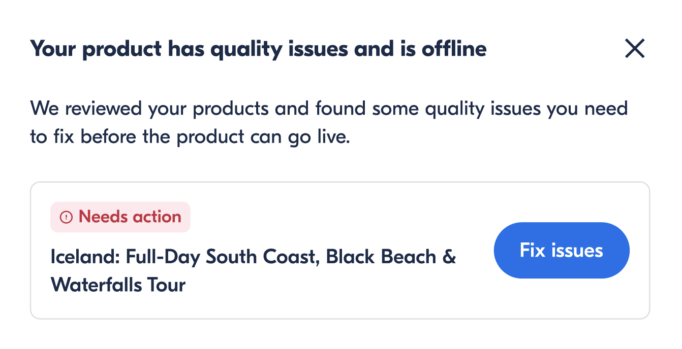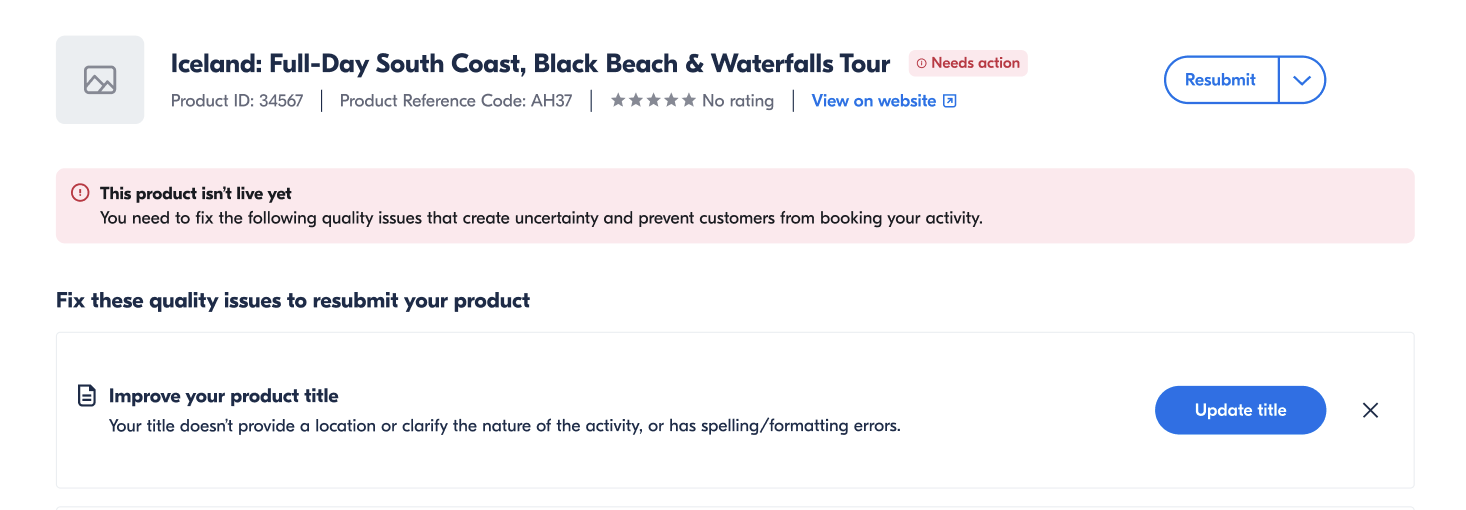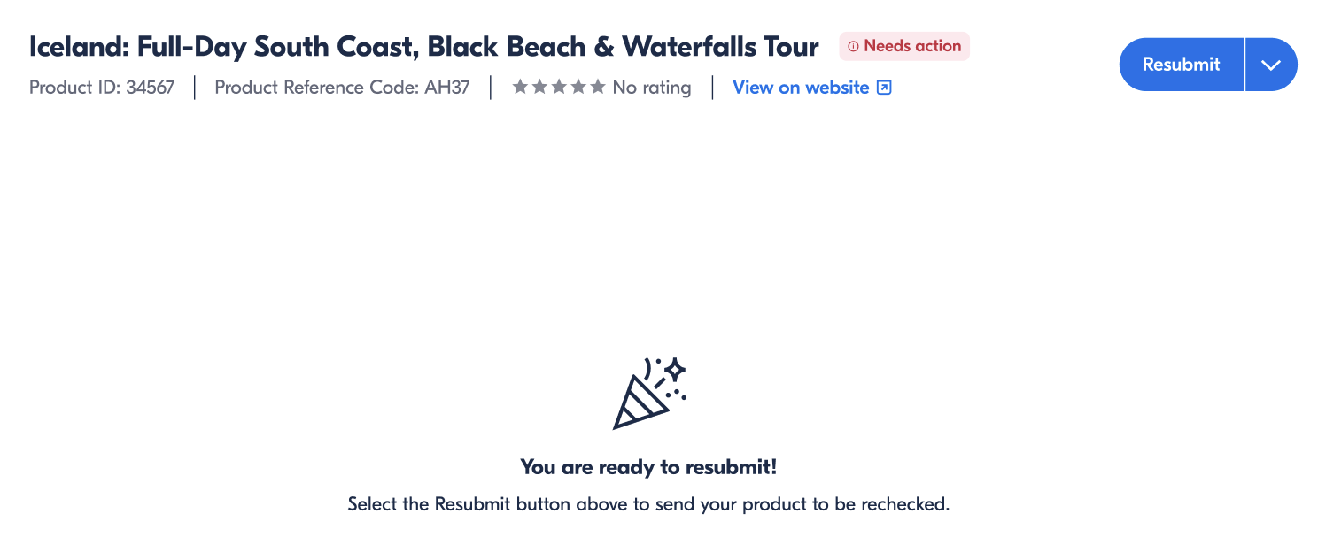 สิ่งสำคัญ: ตรวจสอบให้แน่ใจว่าปัญหาคุณภาพทั้งหมดได้รับการแก้ไขอย่างทั่วถึงก่อนส่งสินค้าของคุณอีกครั้ง สิ่งนี้จะช่วยเร่งกระบวนการอนุมัติและปรับปรุงประสิทธิภาพสินค้าของคุณบน GetYourGuide