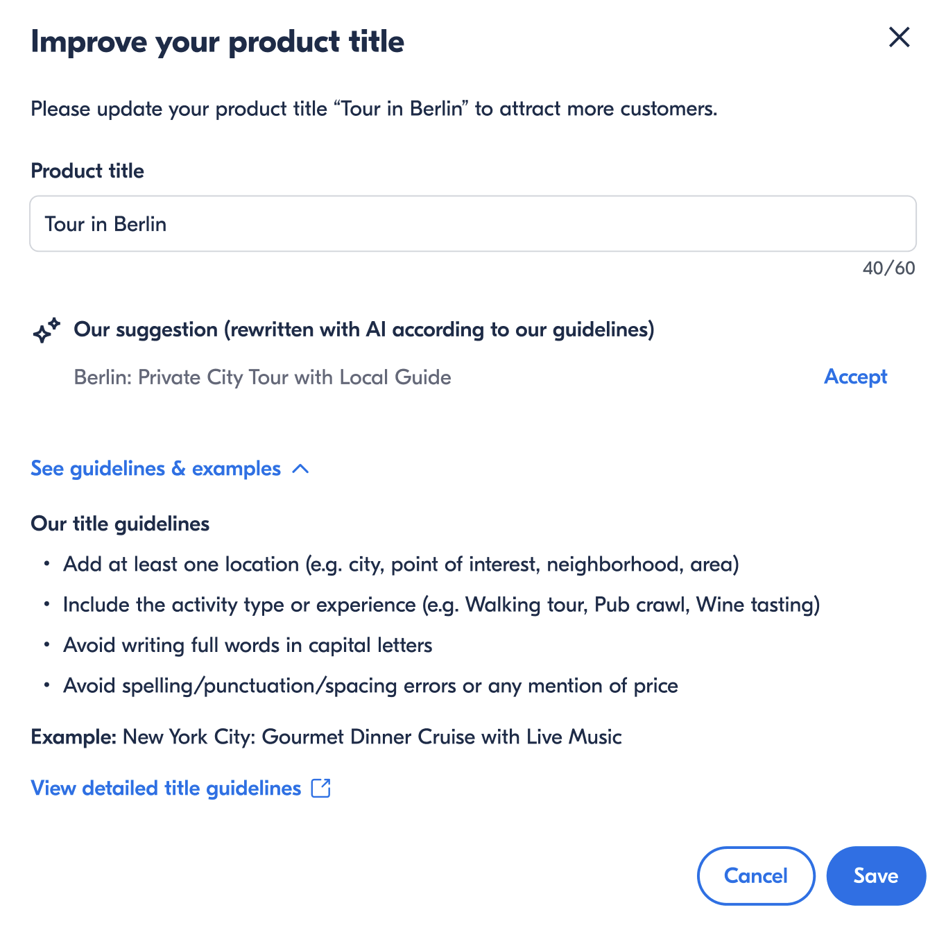 เมื่อคุณส่งสินค้าใหม่ไปยัง GetYourGuide สินค้านั้นจะได้รับการตรวจสอบเพื่อให้แน่ใจว่าตรงตามมาตรฐานมาร์เก็ตเพลส มีตัวเลือกที่แตกต่างให้แก่ลูกค้า และตั้งค่าให้มีประสิทธิภาพสูงสุด หากพบปัญหาด้านคุณภาพ คุณจะได้รับอีเมลพร้อมรายละเอียดปัญหาและลิงก์สำหรับส่งสินค้าของคุณอีกครั้ง